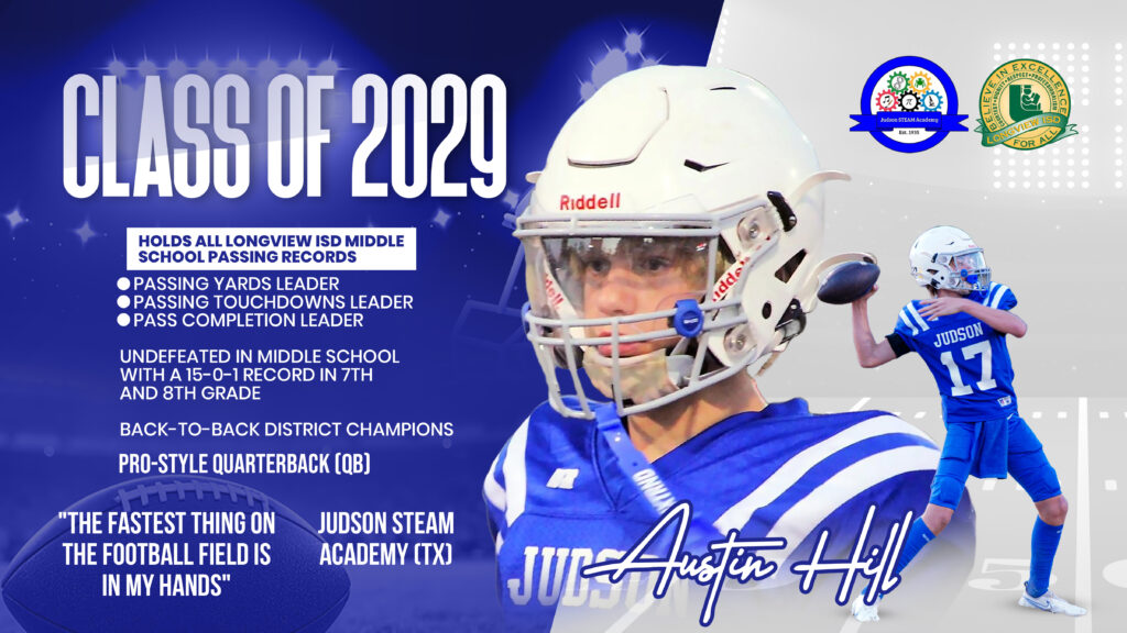 In the heart of Longview, Texas, a young quarterback is building a legacy that stretches far beyond his years. Austin Hill, affectionately nicknamed “Smiles,” is a Class of 2029 pro-style QB with an infectious enthusiasm for football and life. Currently attending Judson STEAM Academy for middle school, Austin is preparing to transition to Longview High School, where he plans to continue his journey as a Longview Lobo.