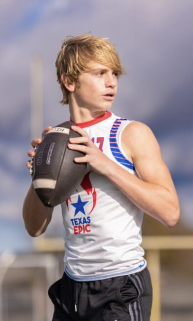 Not one to shy away from challenges, Austin played his entire 8th-grade season with a broken big toe, learning firsthand the power of mental toughness and perseverance. Now, as he prepares for high school, Austin is laser-focused on his goals. He aims to break all passing records set by Longview Lobos legend Haynes King and lead his team to more Texas UIL State Championships. In 7on7, he’s determined to guide his Texas Epic squad to the #1 national ranking after finishing 13th last season.