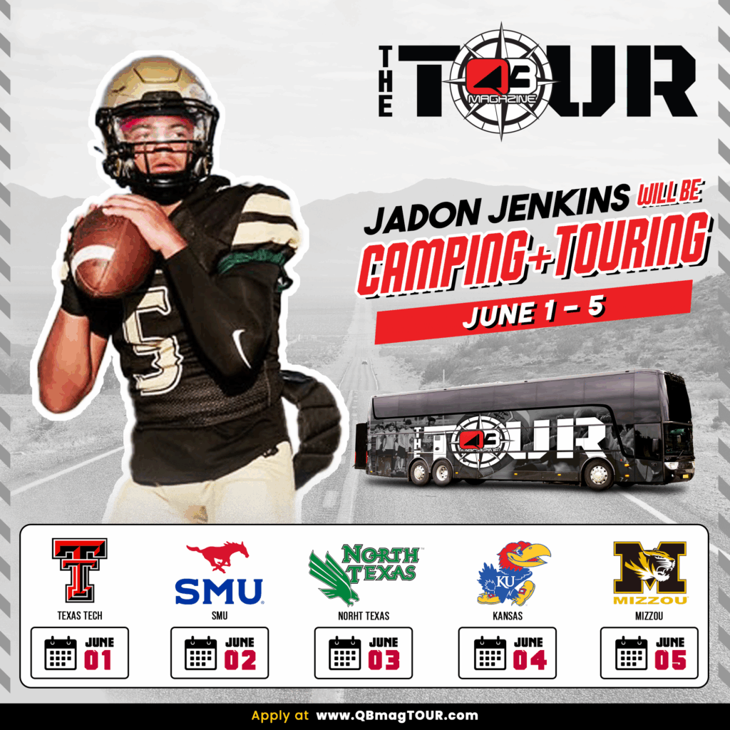 Jadon is headed on his second College Bus Tour with Quarterback Magazine this June 1–5. He will be showcasing his skills in front of top collegiate coaches at Texas Tech University, University of North Texas, SMU, University of Kansas, and University of Missouri—an exciting opportunity to take the next step in his football journey and gain exposure on some of the biggest stages in college football recruiting.